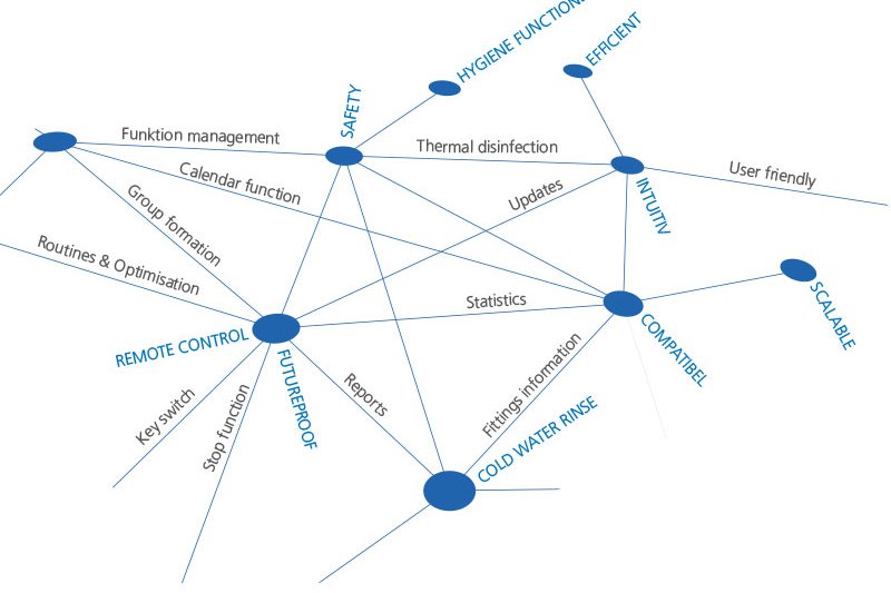 All hygiene measures (hygiene rinsing with a mixed washer, thermal disinfection with hot water, and, most recently, cold water rinsing) can be planned in advance and carried out safely. The system is designed to be easy to use and maintain, with all components being easy to access and clean.