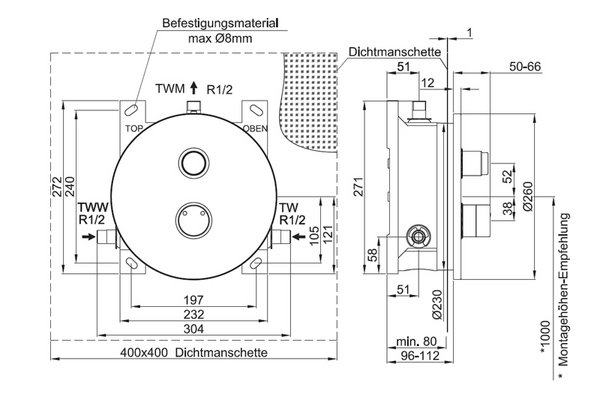 Final assembly kit for mechanical shower, device designed as concealed shower in nominal diameter DN15. With thermostatic mixing device for connection to cold and hot water. Application in new construction building and renovation in commercial, semi-public and public sanitary facilities.